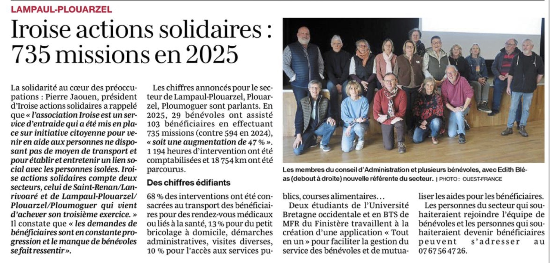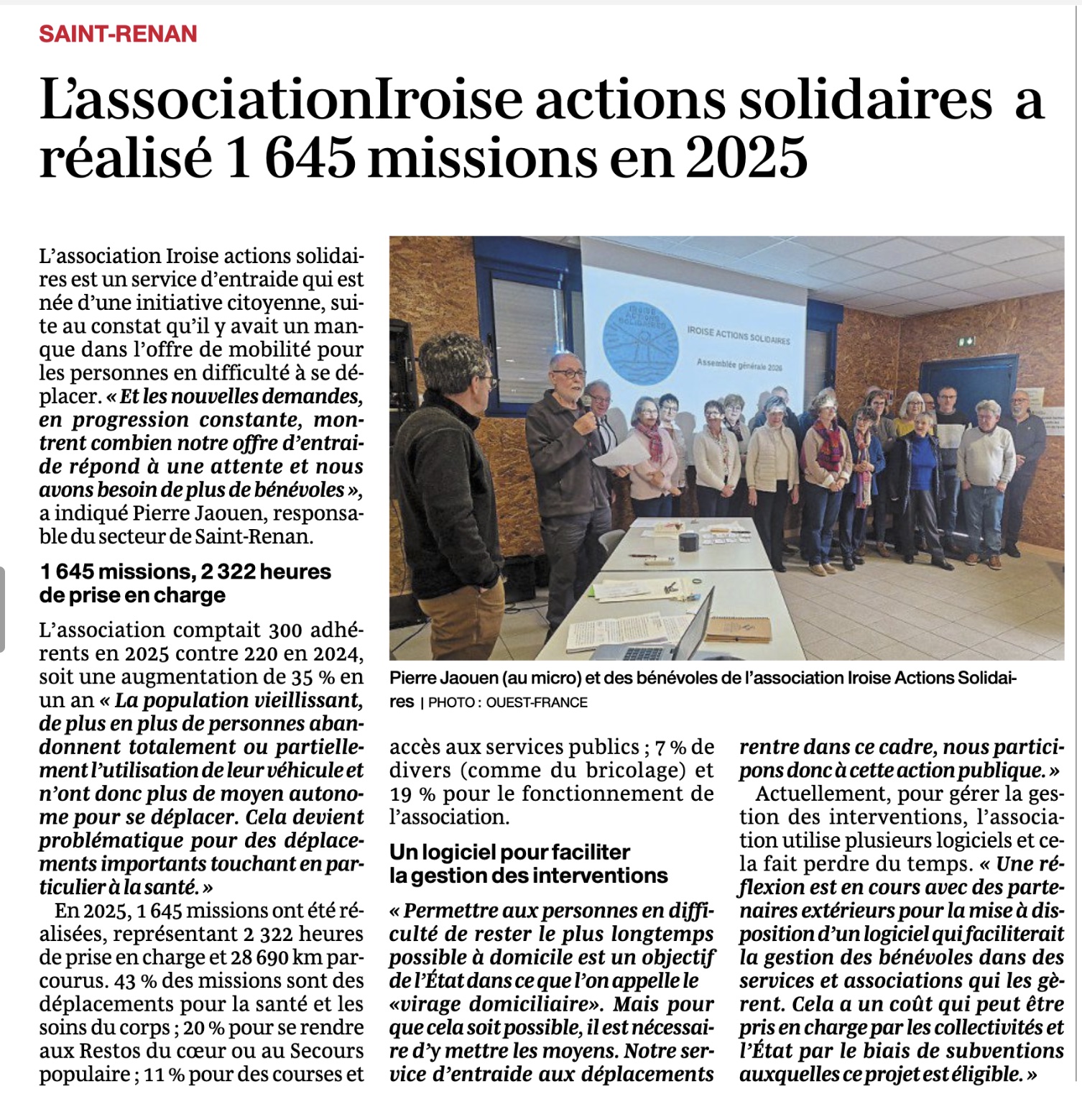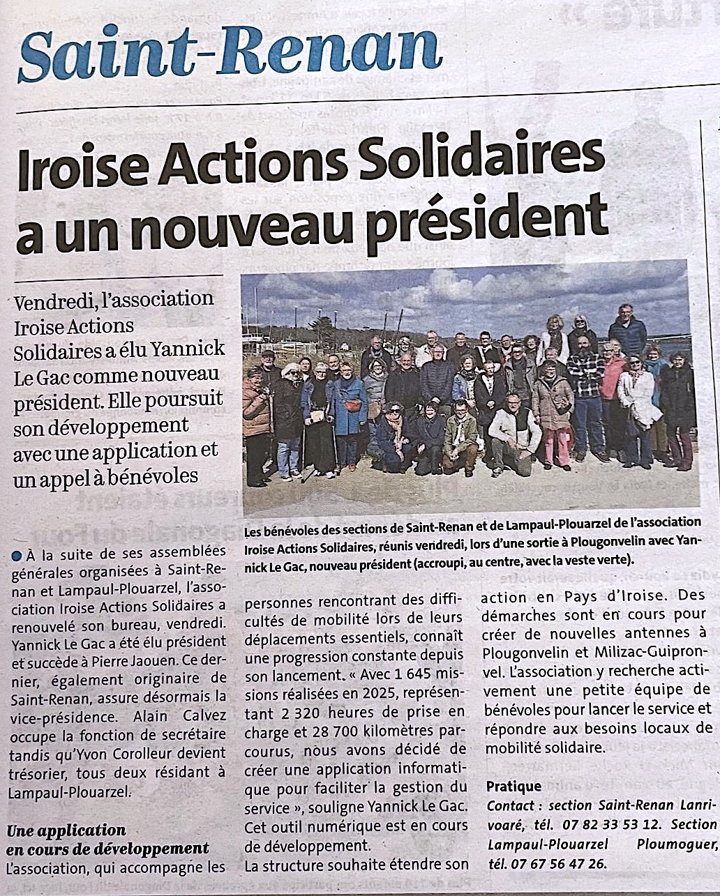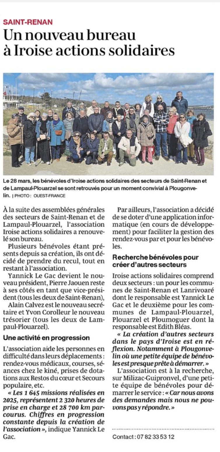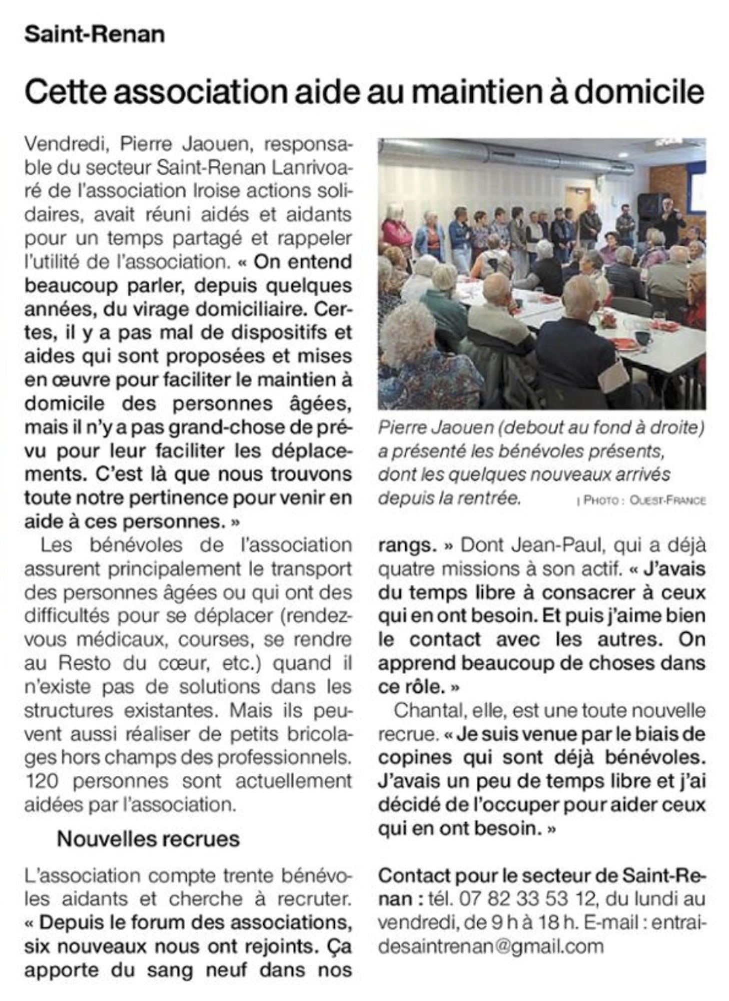 La première assemblée générale d'Iroise Actions Solidaires et 4 ème année d'existence du service (précédemment sous Entraide Plus Iroise) sur les communes de Saint Renan et Lanrivoaré :